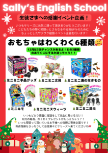 いつもサリーズに元気に通って頂き誠にありがとうございます! こどもたちの輝く笑顔☺とさらなるやる気アップ↑のために、ちょっとしたわくわく宿題イベント企画を行います🎵 12月は3週あるので3回チャンスがあります^^どの3種類のあてくじにするか迷っちゃう! わくわくのおもちゃは6種類🥰 ①ミニミニ手品グッズ ②ミニミニ文具 ③ミニミニ海の生き物 ④ミ二キモ ⑤ミニミニスイーツ ⑥ミニミニ昆虫 いつも通り完璧に宿題をして先生に見せるだけ! (*宿題がないベビークラスは頑張ってきてもらうだけで毎週もらえます🎵) 12月の毎週、わくわくプレゼントがもらえちゃう?! いつも頑張って頂いているお子様への✨宿題ご褒美企画✨です! 毎週宿題をきっちりして自信満々にサリーズへ来てくださいね💗 […]
