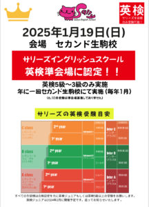 📚サリーズイングリッシュスクールからセカンド生駒校英検準会場での英検5級から3級受験の申込ご案内です📚 この度サリーズイングリッシュスクールが英検一次試験準会場に認定されました!! 年に1回毎年1月にセカンド生駒校にて受験できるようになりました!! (6、10月受験は募集していません) *サリーズ生徒様のみ受験可能です(外部生は不可) *申し訳ございませんが、今回は5級、4級、3級のみの受験される方対象になります。 ❄❄❄❄❄❄❄❄❄❄❄❄❄❄❄❄❄❄❄❄❄❄ 日時・受験料(本会場よりお安くなります) 試験日 2025年1月19日(日) 5級🈵着席 9:45 試験10:15-11:05 (試験時間約50分) 2,500円税込🈵 4級 着席11:30 試験12:00-13:10 […]