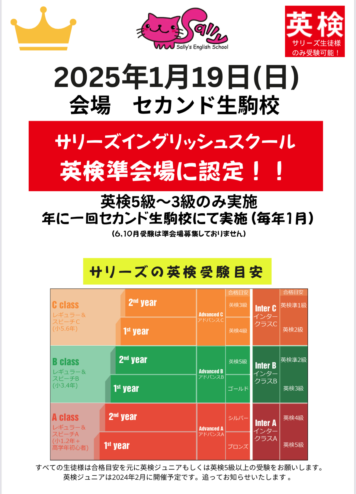 📚サリーズイングリッシュスクールからセカンド生駒校英検準会場での英検5級から3級受験の申込ご案内です📚