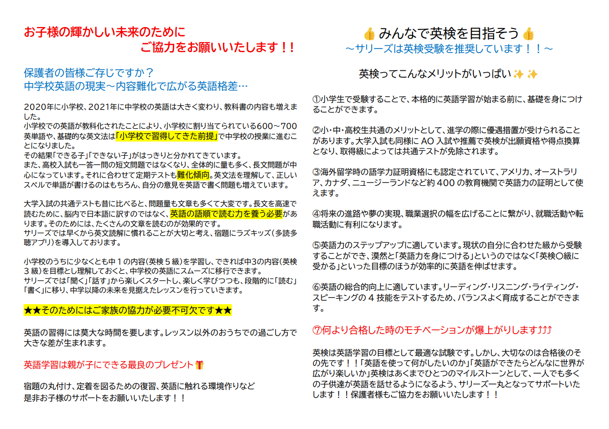 英検のおすすめテキストをご案内します✨☺ 英検は、【予想問題ドリル・パス単・過去問】の3つで半年~3ヶ月前にしっかり計画して挑戦していきましょう! サリーズでは多くの生徒様が英検に挑戦し、 小学生の間に【英検ジュニアブロンズ~準1級】とすばらしい合格実績を輩出 しております!会話とはまた違い英検独特の癖のある問題もたくさんありますので、対策はとても大切です。 英検の重要性・大切さはこちらのPDFをご覧ください! 最近の英検は英作文や要約が増えたりなど年々難化しております。それに対応する力をつけるためには小さい頃からどんどん本格的な学習・対策をしないと間に合いません! 最近では、「英語を制する者は受験を制す」と言われております。お子様の輝かしい未来のために英検に挑戦していきましょう!(ただし、英会話力・コミュニケーション能力を同時に磨いていくこともお忘れなく♪) […]