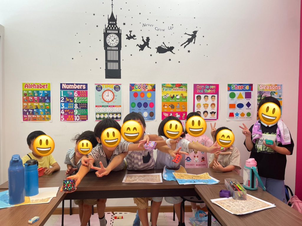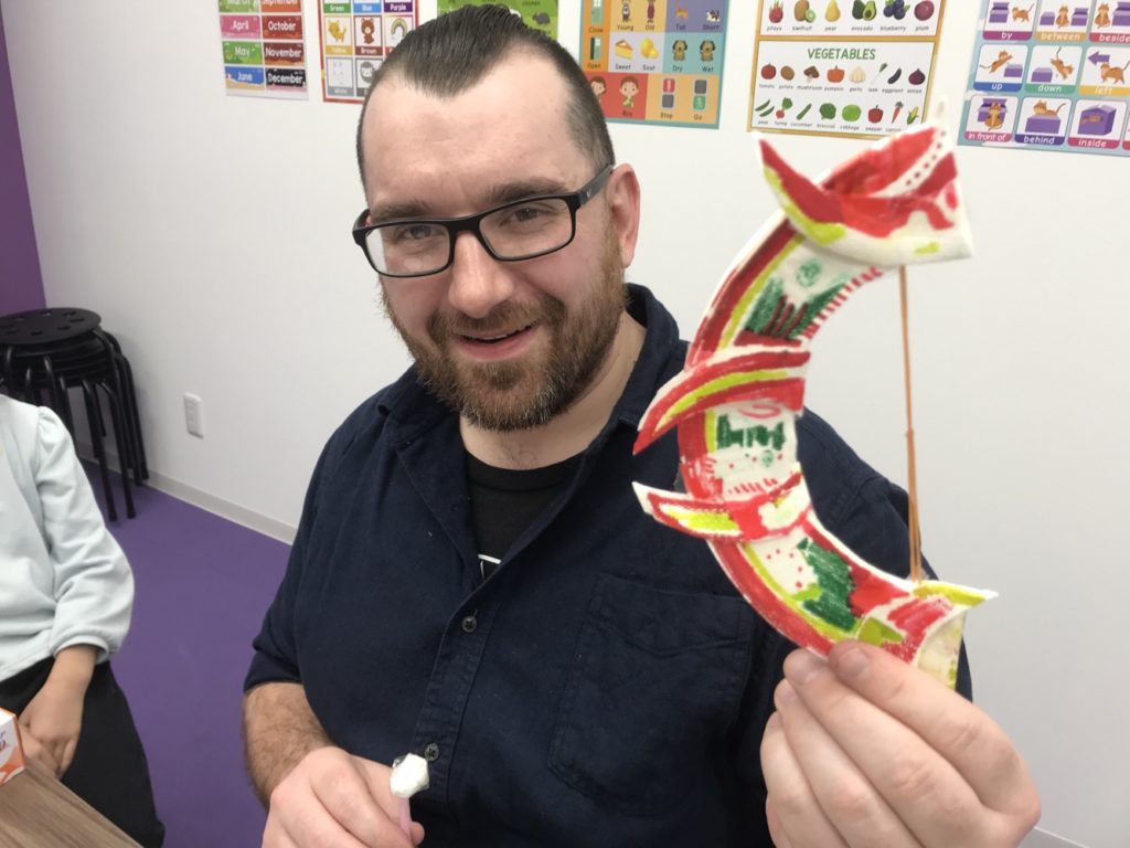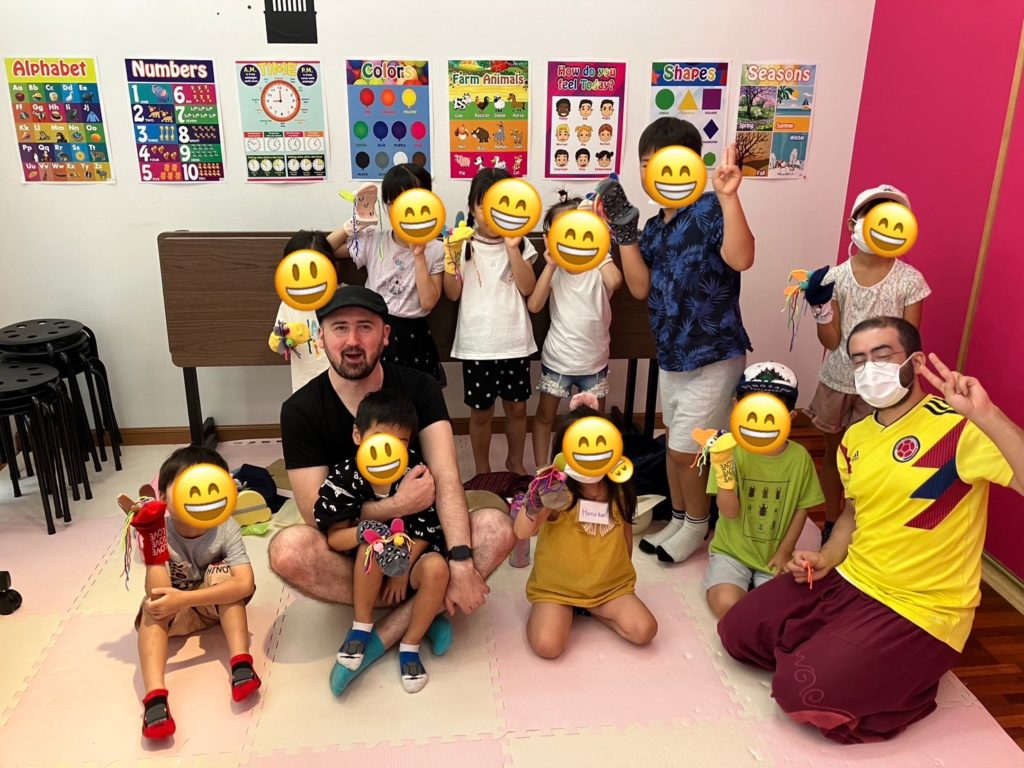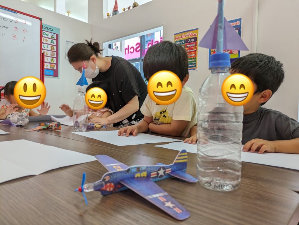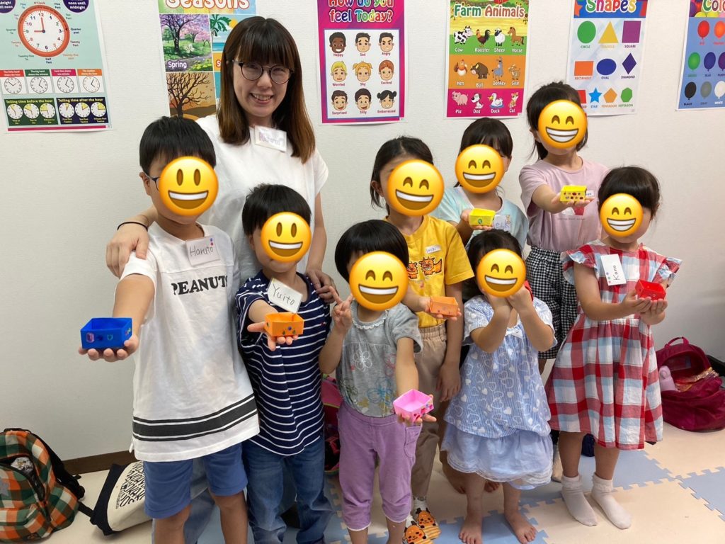 自分たちの作った玩具を先生やほかの生徒さんとお互いに見せ合って楽しそうに手作りおもちゃで遊びながら英語を学んでいました♬
