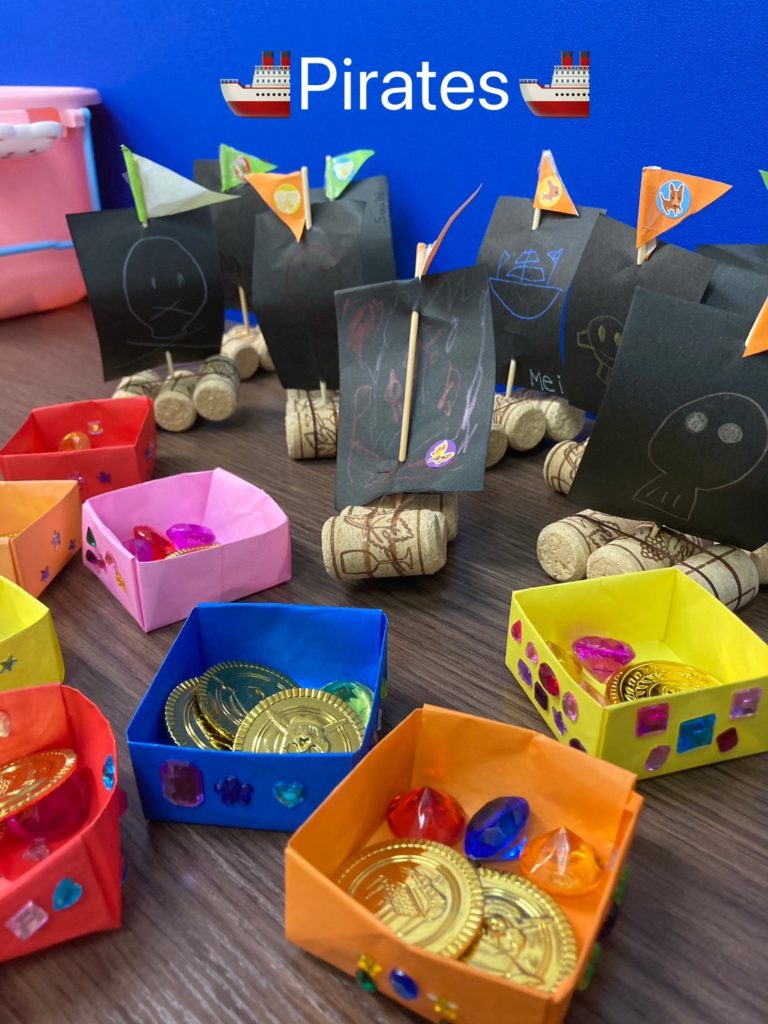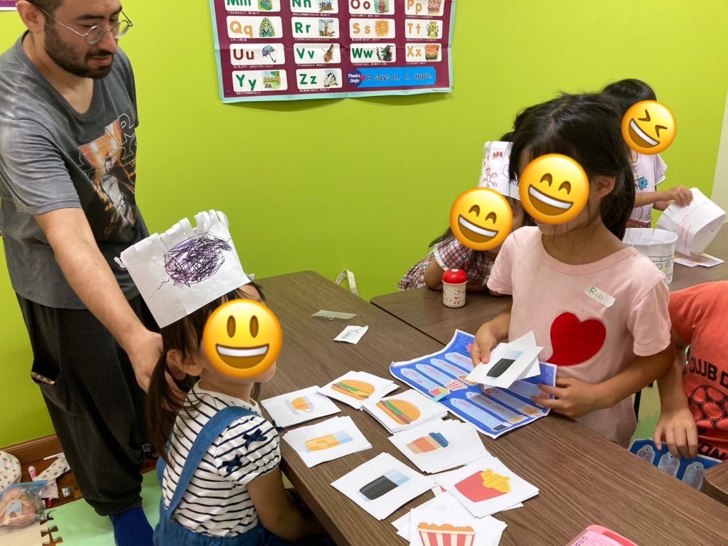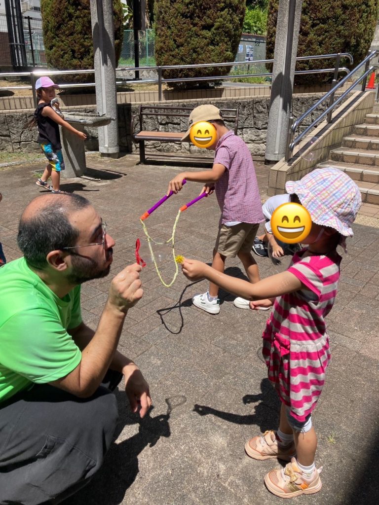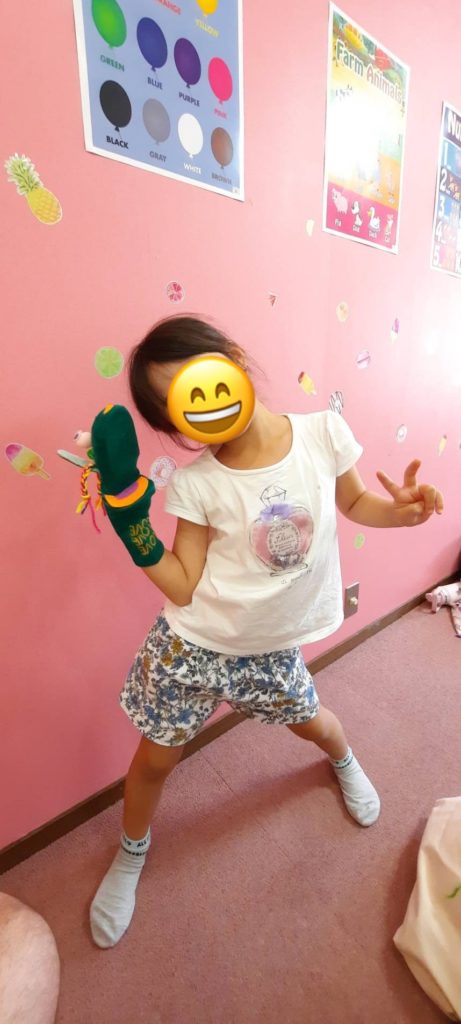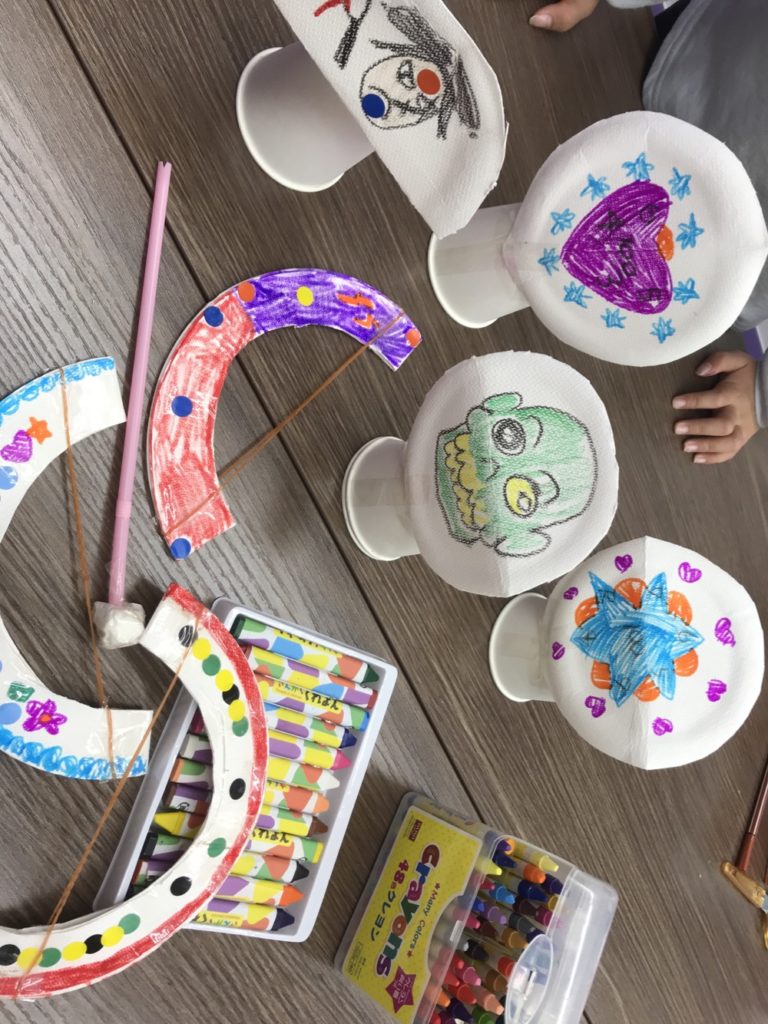 自分たちの作った玩具を先生やほかの生徒さんとお互いに見せ合って楽しそうに手作りおもちゃで遊びながら英語を学んでいました♬