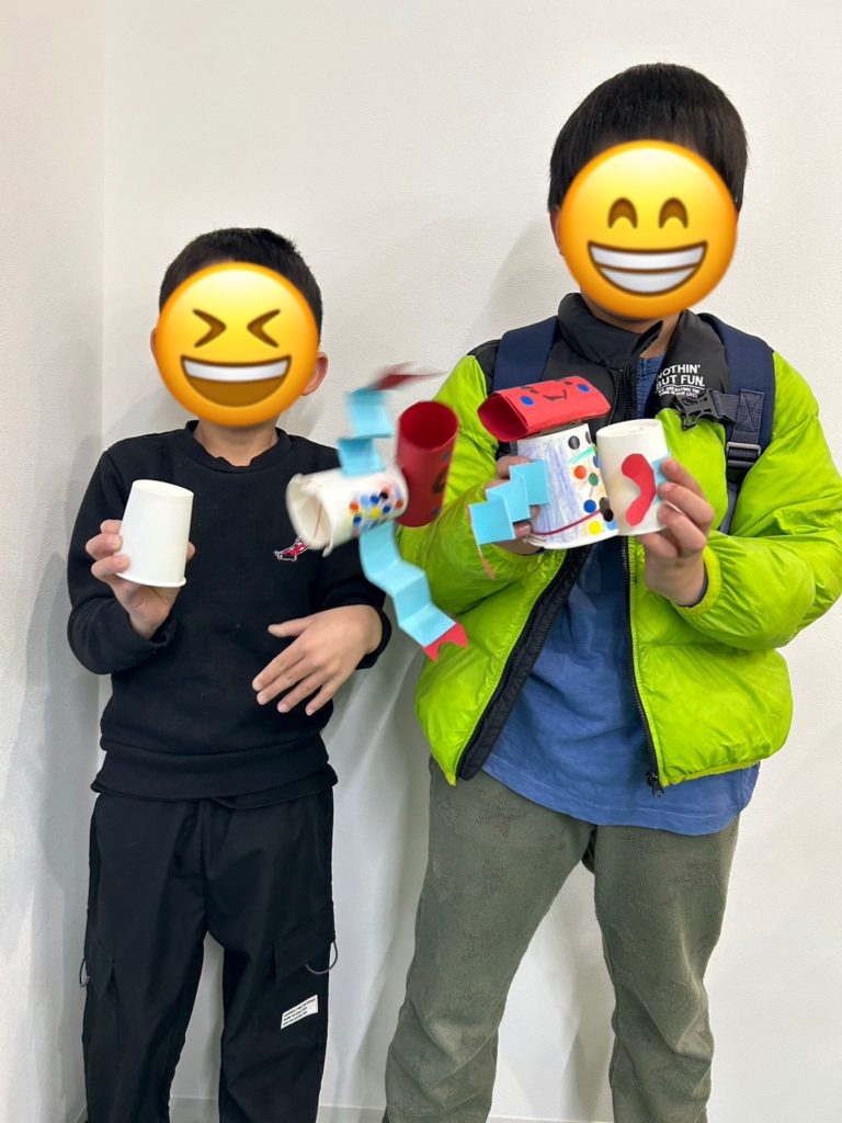 参加してくれた生徒さんたちは、紙コップや画用紙、輪ゴムなどを使って跳ねるおもちゃを作ってくれました!