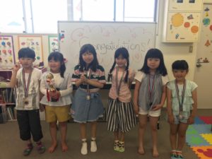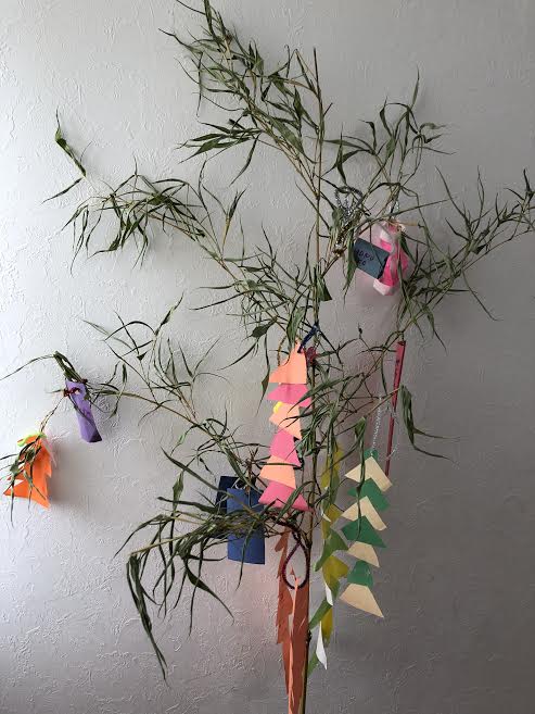 We made lots of TANABATA decorations such as lanterns, stars and watermelons and the other beautiful things to put on a bamboo branch! Everyone was so creative and made real nice decorations! We also wrote wishes on Tanzaku and their wishes are very unique.