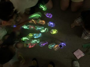 ボーリングもしました! ペットボトルの中に光るステックを入れて、ボーリングピンを作って、暗いお部屋でゴーリングしました! 暗い中で光るボーリングピン、とってもキレイでした!