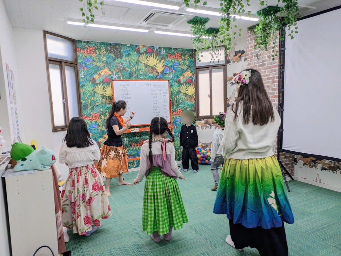 フラダンスでは、特別講師をお招きして、英語とハワイ語を学びつつ、ダンスの動きを練習して、音楽に合わせて踊りました(^^♪