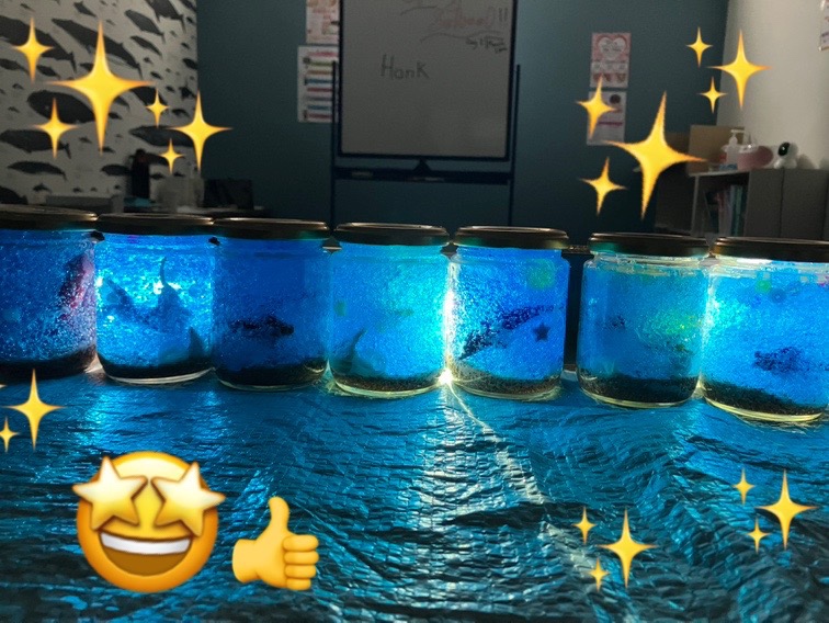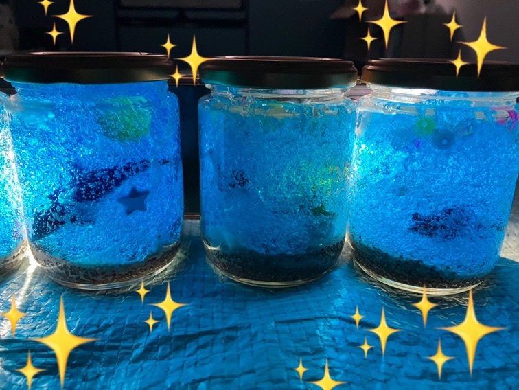 美しい海のビンが完成したら、部屋を少し暗くして照らしてみると・・・・