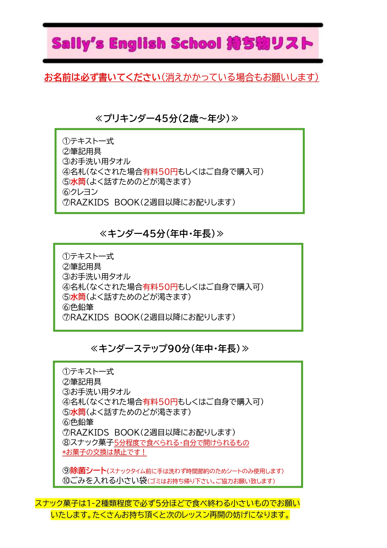 👇こちらの画像<キンダー45分 /キンダーステップ90分>の持ち物をご覧ください